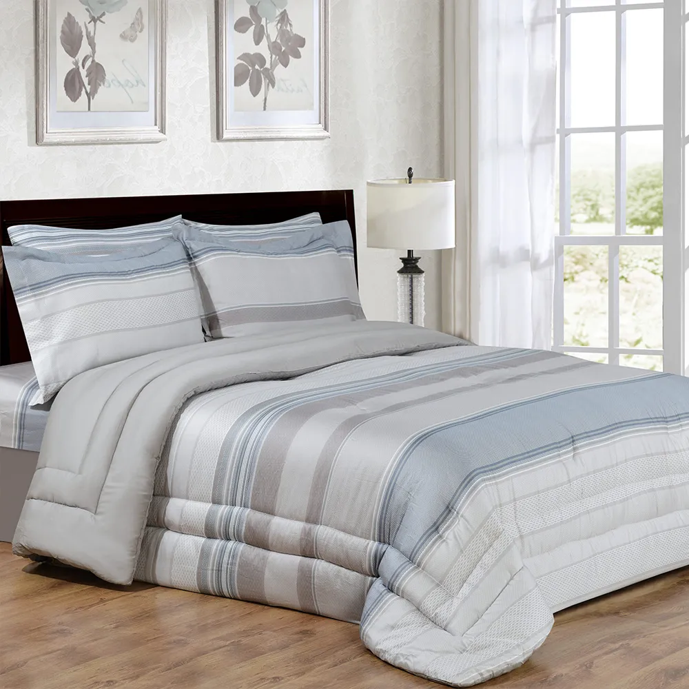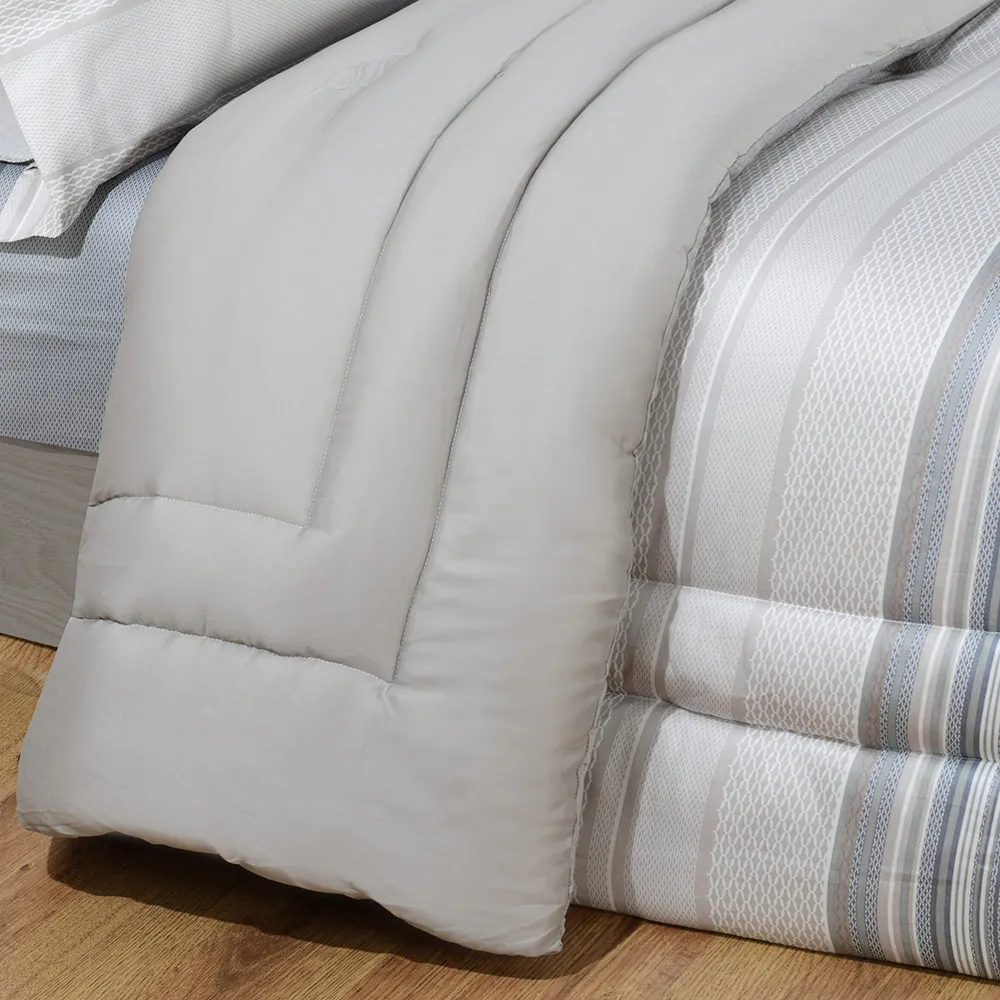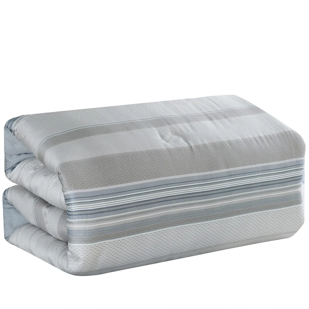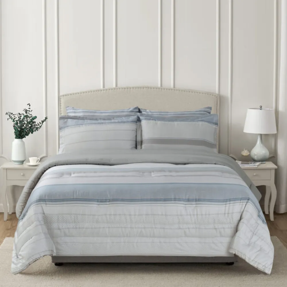 Immerse yourself in the rejuvenating comfort of our cotton sateen comforter set. This 100% Egyptian cotton comforter set keeps you comfortable year-round, transforming your bed into a haven of tranquility. Egyptian Cotton, renowned for its exceptional quality, is among the world’s finest. Beyond its sumptuous softness, its long-staple fibers ensure lasting durability, resisting tearing and piling. The Sorento set harmoniously blends muted colors in a horizontal stripe arrangement. The design evokes a relaxed and calming color scheme reminiscent of the tranquil serenity found in a summer sky.